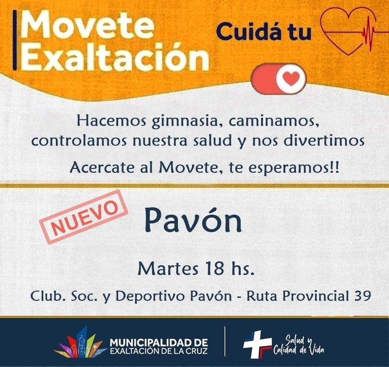 Movete Exaltación 0 Trooper 4, May, 2023 Salud y Calidad de Vida Nos seguimos moviendo en Capilla, Robles, Sakura y ahora también en Pavón.Hacemos rutinas de ejercicios, controlamos nuestra salud y bailamos para mantener nuestro cuerpo en movimiento.Mirá los días, horarios y lugares Compartir: