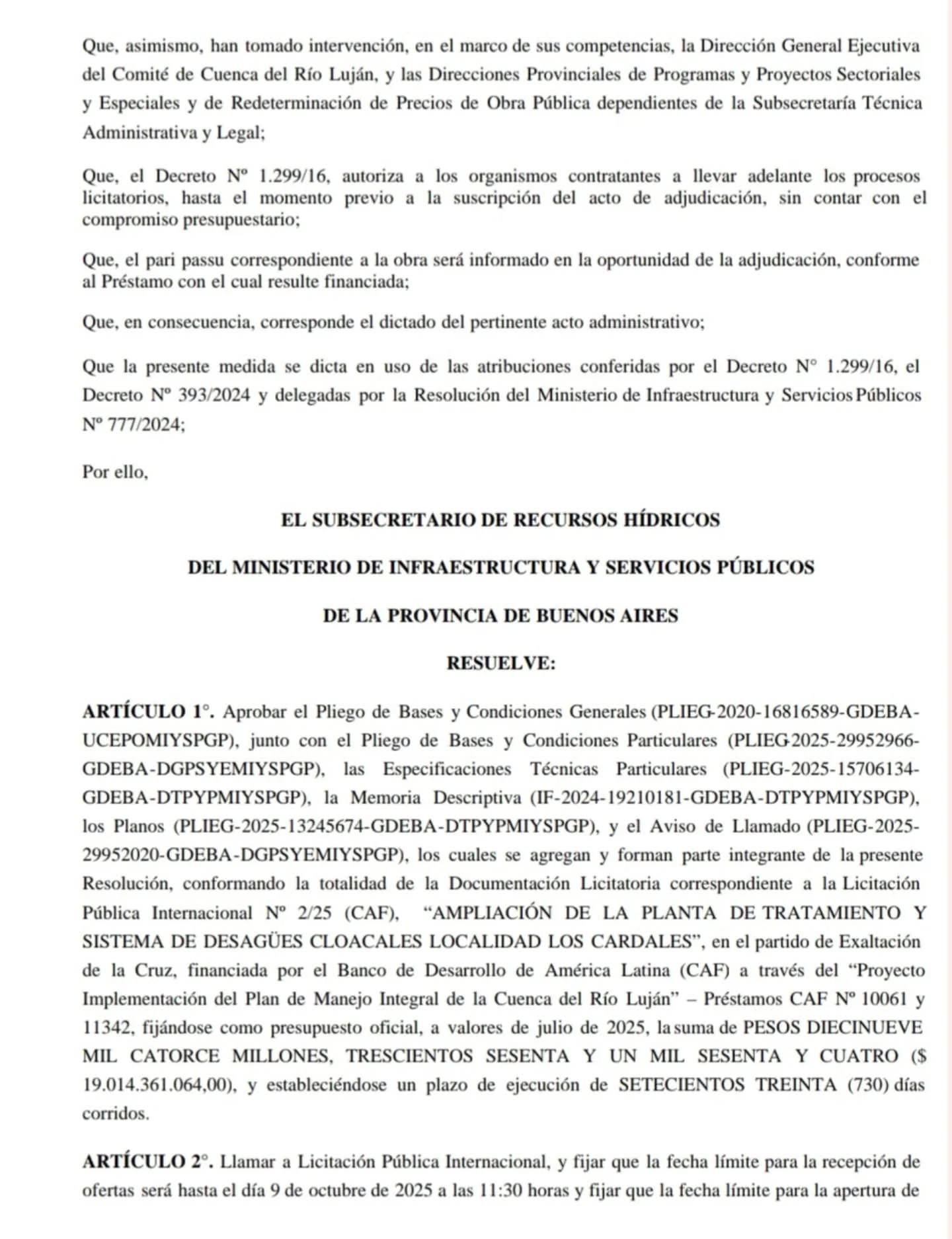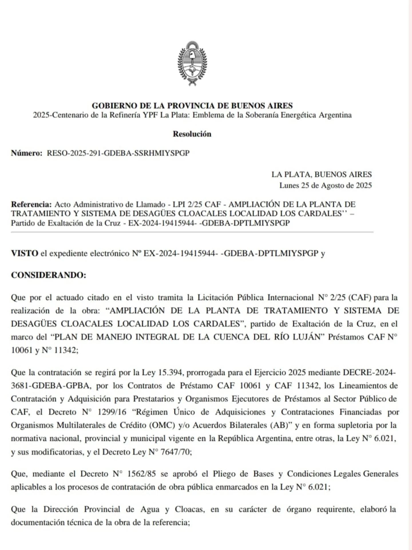 La provincia de Buenos Aires lanzó el llamado a licitación pública nacional e internacional para la ampliación de la planta de tratamiento y el sistema de desagües cloacales de Los Cardales, una obra tan esperada como necesaria, que la gestión se viene impulsando desde hace años.