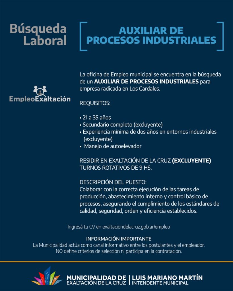 AUXILIAR DE PROCESOS INDUSTRIALES 0 Macarena Fioretto 13, Feb, 2026 Compartir Categoria: Presencial Tipo de trabajo: Full Time Lugar: Los Cardales Solicitar este puesto Nombre completo *Correo electrónico *Teléfono *Carta de presentación *Subir el currículum *Tipo(s) permitido(s): .pdf, .doc, .docxAl utilizar este formulario, usted acepta el almacenamiento y manejo de sus datos por parte de este sitio web. *