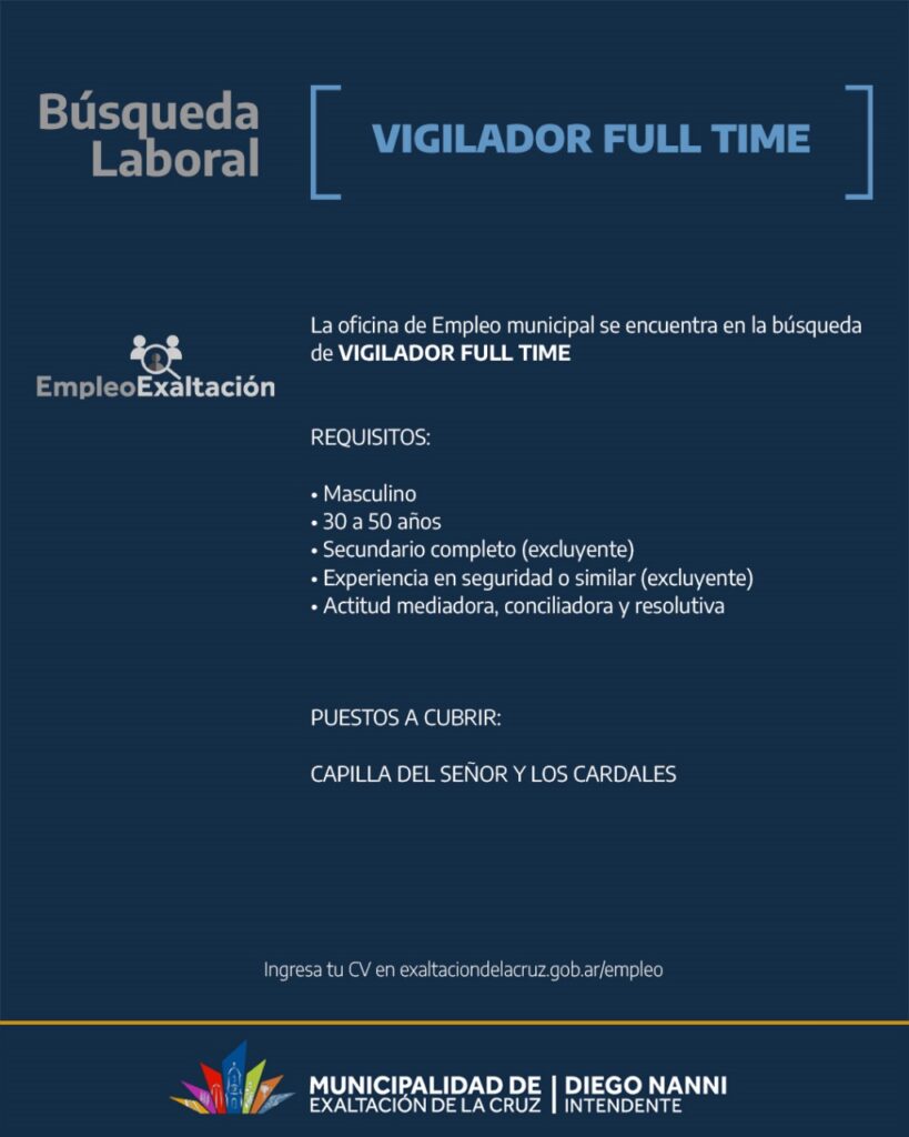 VIGILADOR FULL TIME 0 Macarena Fioretto 9, Oct, 2025 Compartir Categoria: Presencial Tipo de trabajo: Full Time Lugar: Capilla del Señor Los Cardales Solicitar este puesto Nombre completo *Correo electrónico *Teléfono *Carta de presentación *Subir el currículum *Tipo(s) permitido(s): .pdf, .doc, .docxAl utilizar este formulario, usted acepta el almacenamiento y manejo de sus datos por parte de este sitio web. *